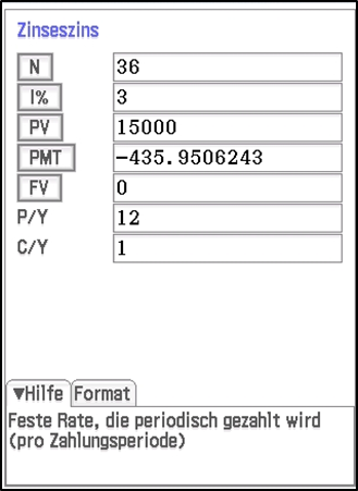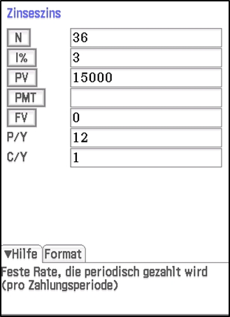 Es öffnet sich ein Eingabefenster. Nach allen in 3-D hervorgehobenen Eingaben kann man die Gleichung auflösen. In unserem Beispiel wollen wir die Rate berechnen. Die ist im Eingabefenster mit „PMT“ verzeichnet.